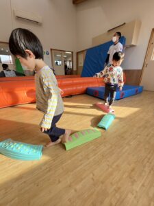 2歳の子たちのクラスも最近は慣れてきて皆エアトランポリンのうえを走ったりジャンプしたりと