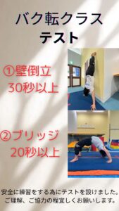 バク転クラスは実際にバク転を練習するクラスになりますが、安全に行うためにテストを実施しますのでご了承ください。