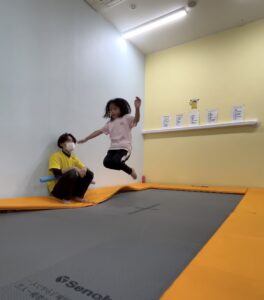 大きいトランポリンはとわ先生が上手で色々な技を僕たちにも教えてくれるのですが、怖くてやる度胸がありません笑