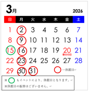 毎週月曜日は休館日となります。