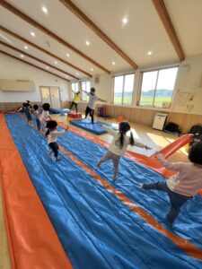 エアトランポリンを跳ぶ前にみんなで倒立、後転などマット運動をしたり、時には跳び箱の練習をしたり。